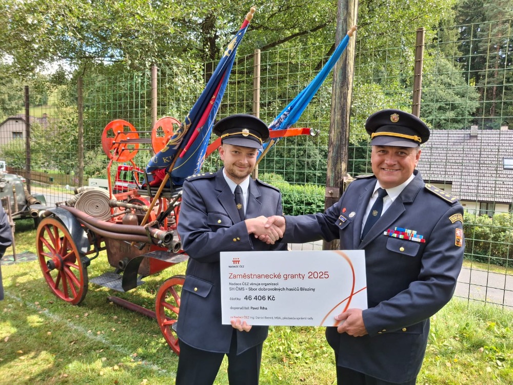 Pavel Říha, zaměstnanec ČEZ Energo, s.r.o., předal symbolický šek na 46 406 Kč starostovi SDH Březiny Jaroslavu Kučerovi. Předání proběhlo při oslavách výročí SDH v Pusté Rybné.