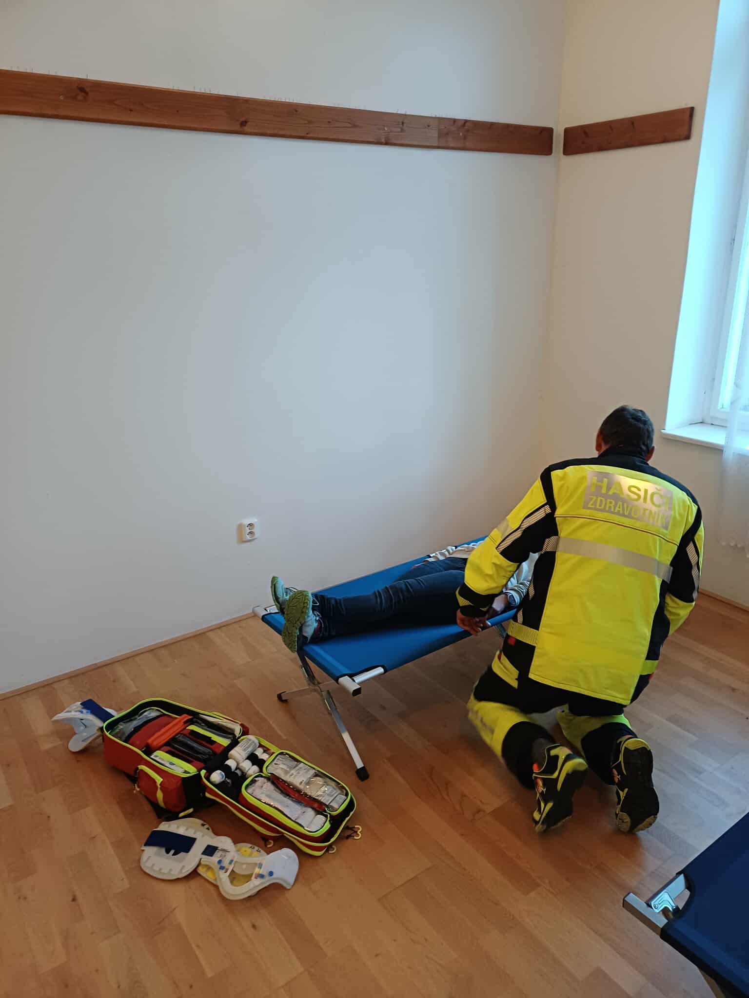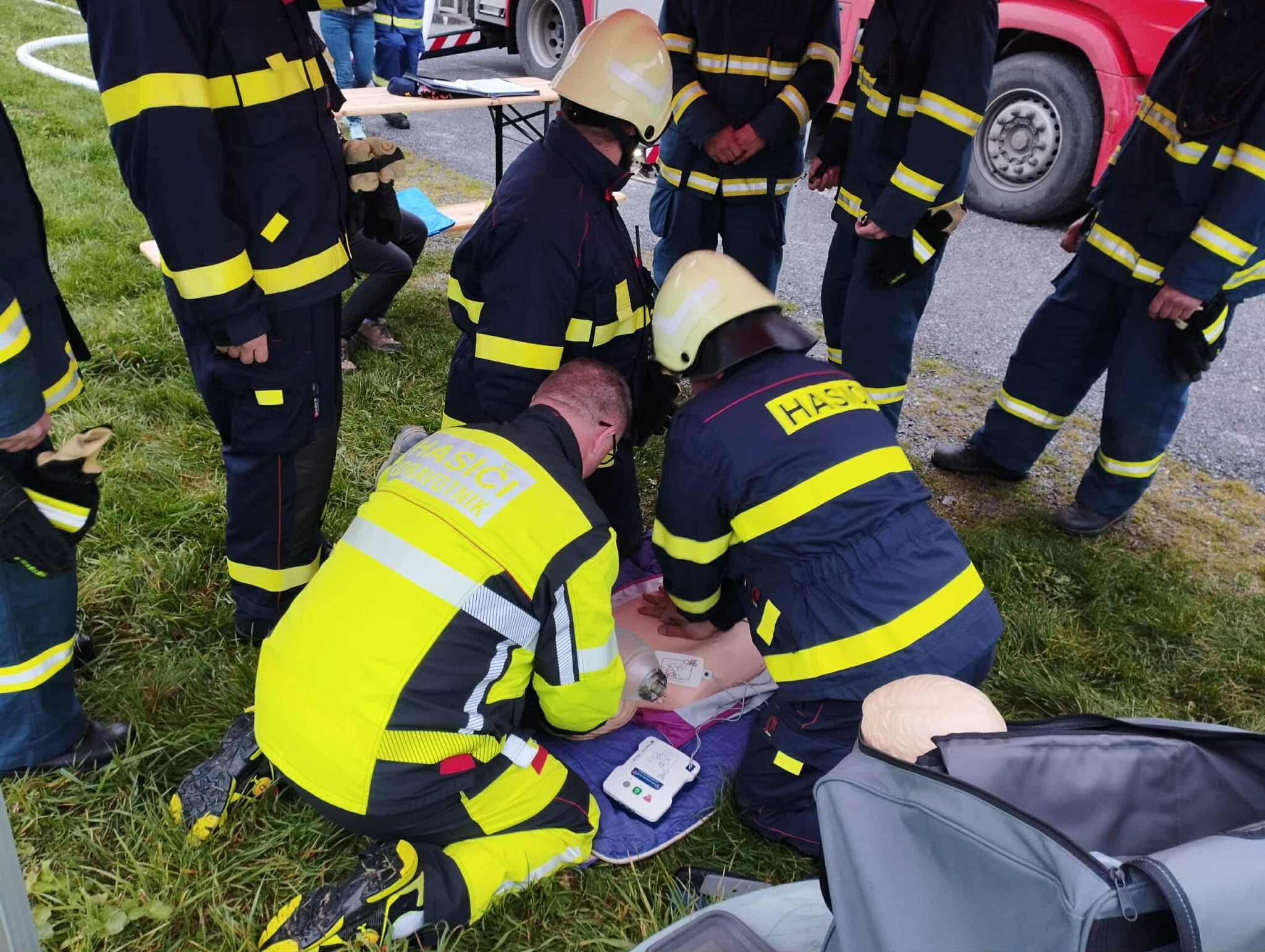 Průzkumné skupiny vybavené izolačními dýchacími přístroji na proudech nalezli zraněné osoby a vyvedli je ven z objektu, kde probíhalo následné ošetřování a resuscitace. Zde se do průběhu cvičení zapojil člen místní skupiny dobrovolníků ochrany obyvatelstva SDH Březiny Daniel Žák, který koordinoval první pomoc zasahujících jednotek a následně zhodnotil poskytovanou první pomoc.